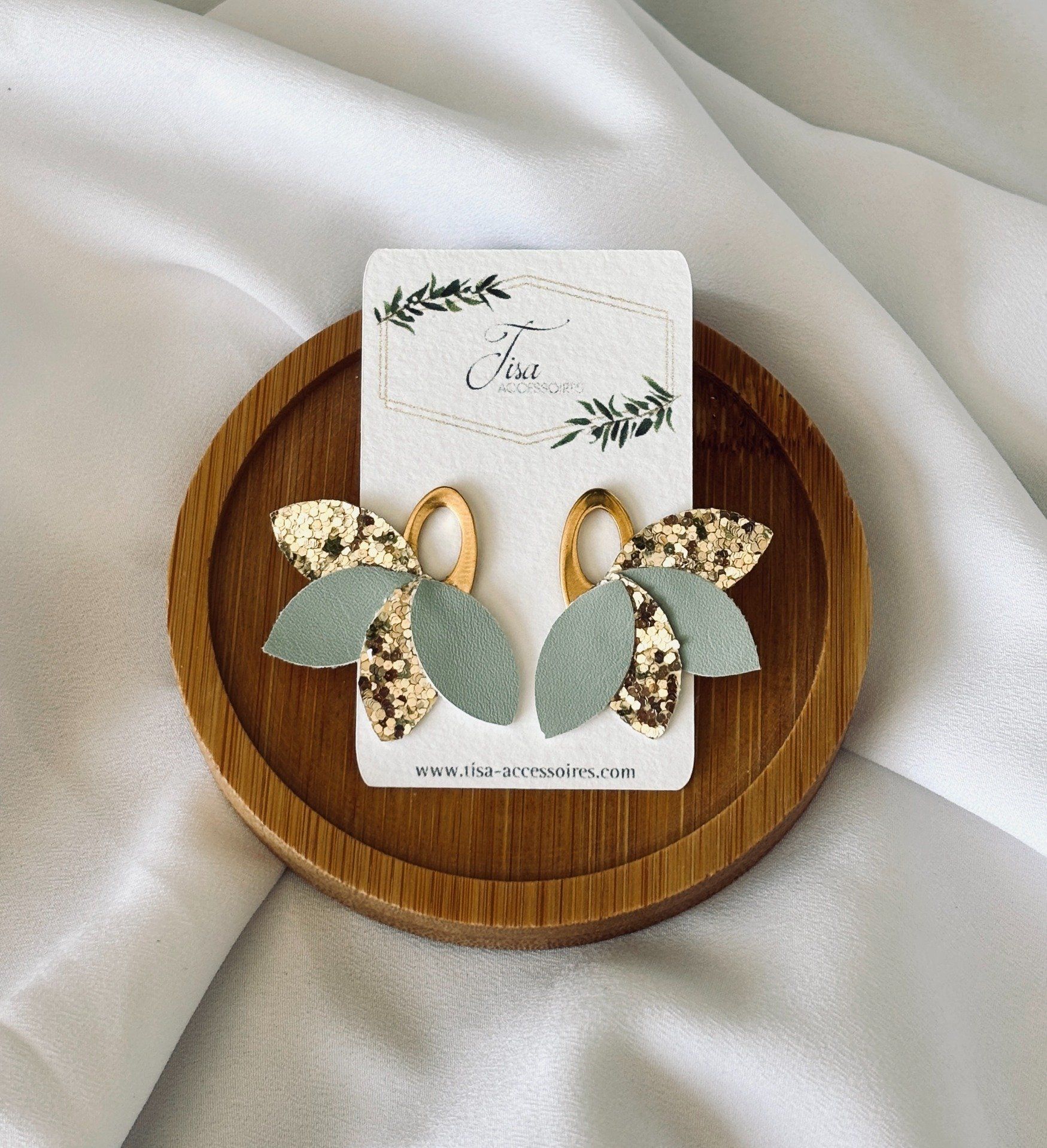 En forme de pétales, alliant cuir coloré et paillettes dorées, pour un look à la fois chic et original.